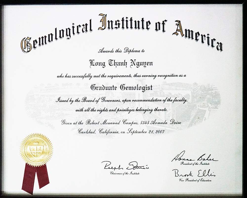 Bằng Chuyên Viên Ngọc Học và Bằng Chuyên Viên Kim Cương được GIA-Viện Ngọc Học Hoa Kỳ cấp cho ông Nguyễn Thành Long-Giám Đốc Kinh Doanh của Công ty