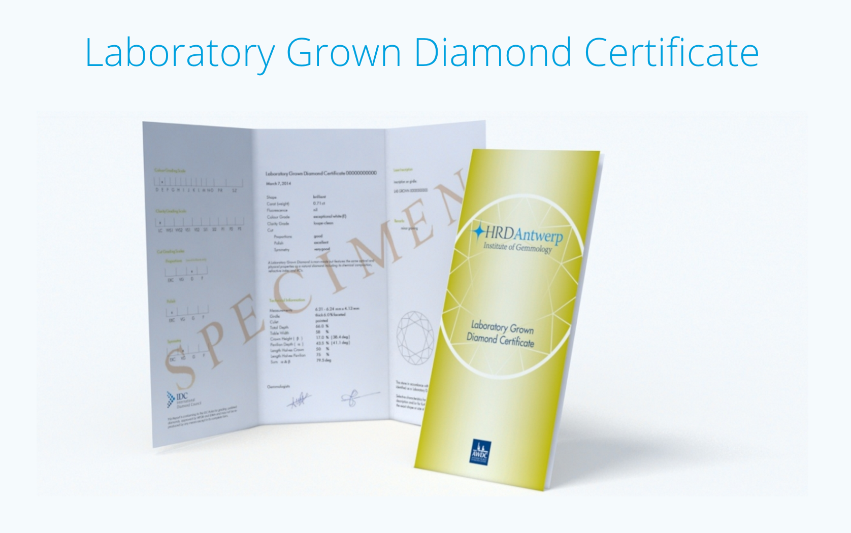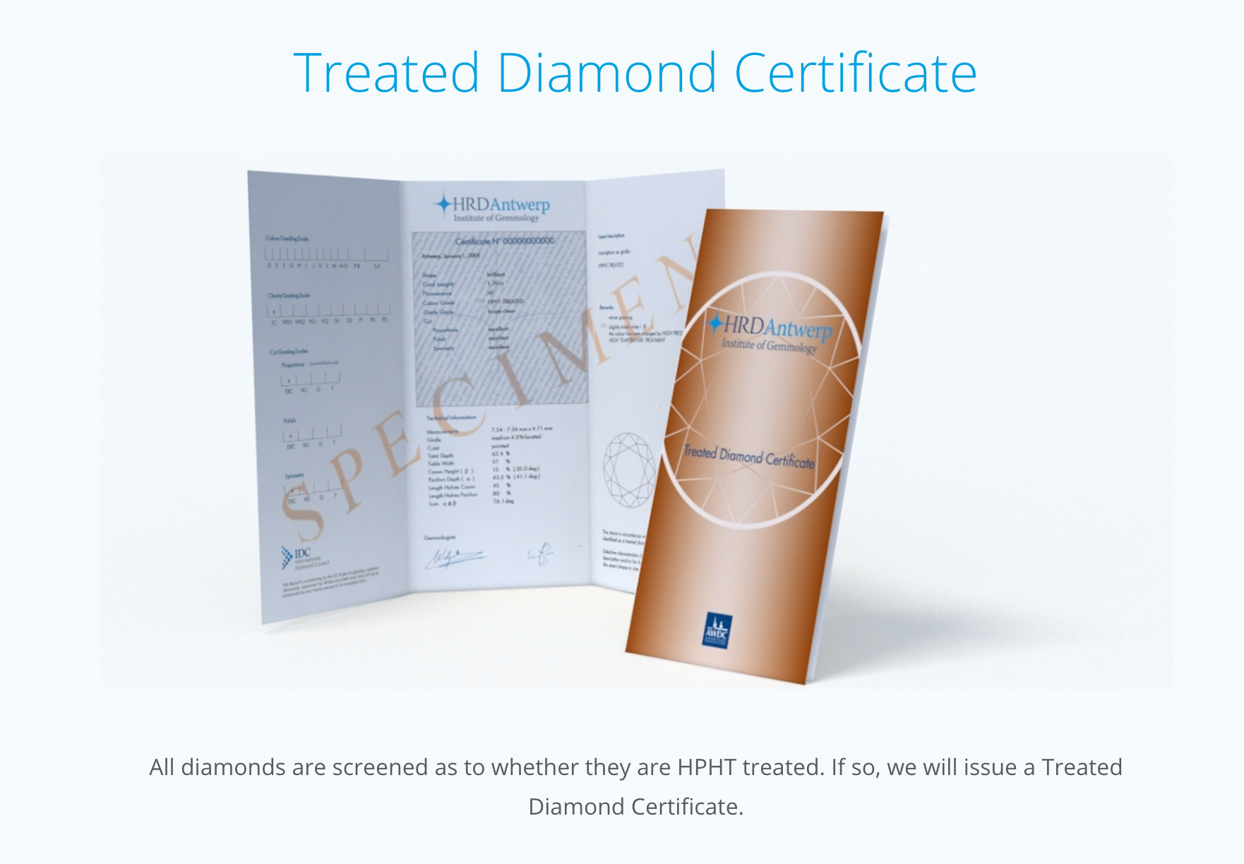 -       Tại phòng kiểm định HRD, Chứng thư kiểm định của Kim Cương Màu Nhân Tạo sẽ ghi rất rõ là Treated Diamond Certificate - Kim cương đã được xử lý, và Labarotary Grown Diamond Certificate - Kim Cương nhận tạo được tạo ra trong phòng thí nghiệm
