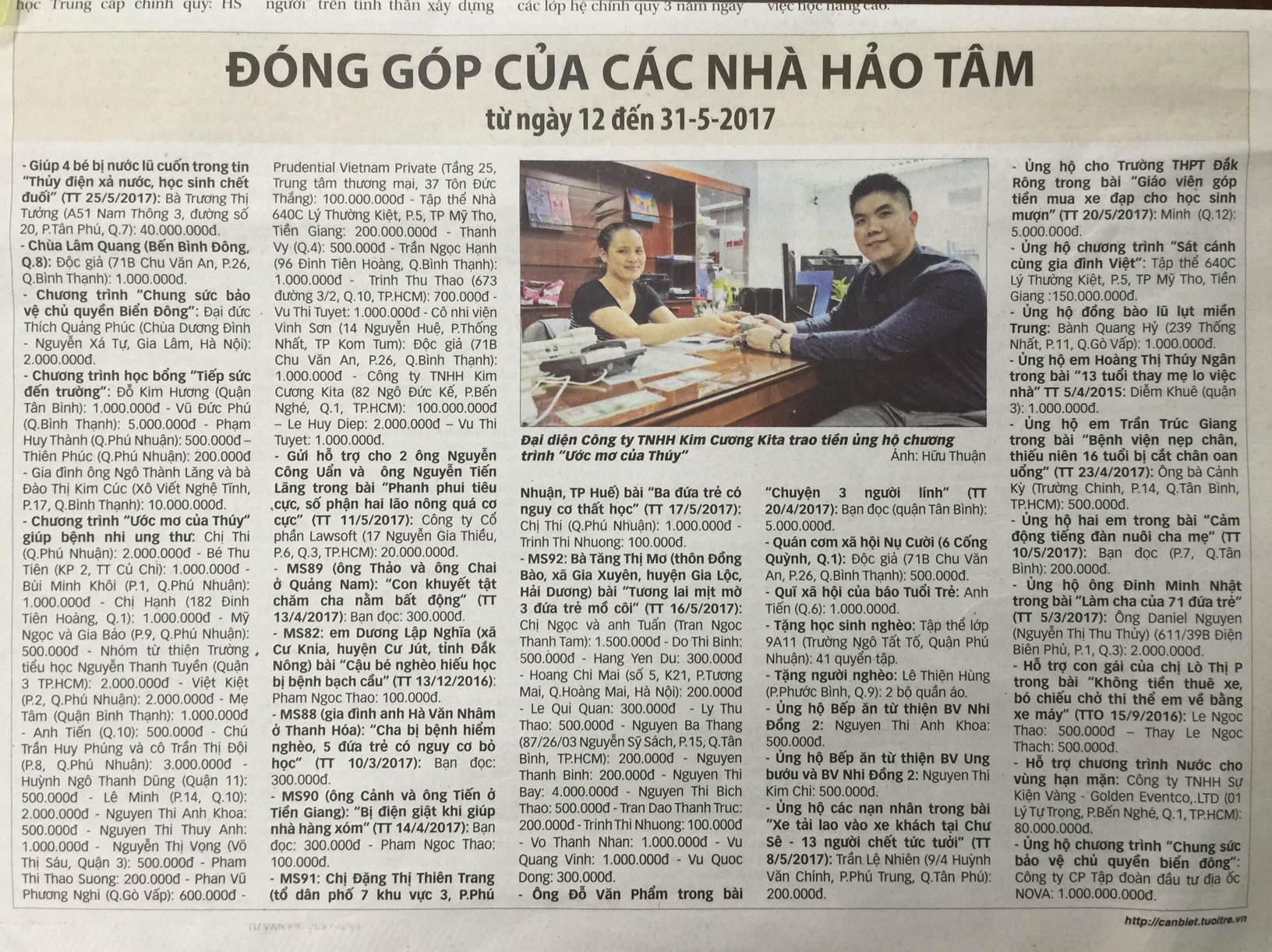 Ngày 31/5/2017, Ông Nguyễn Thành Long, đại diện Công Ty TNHH Kim Cương KITA đã trao tặng 100 triệu đồng cho chương trình Ước mơ của Thúy giúp bệnh nhu ung thư  năm 2017 của báo tuổi trẻ