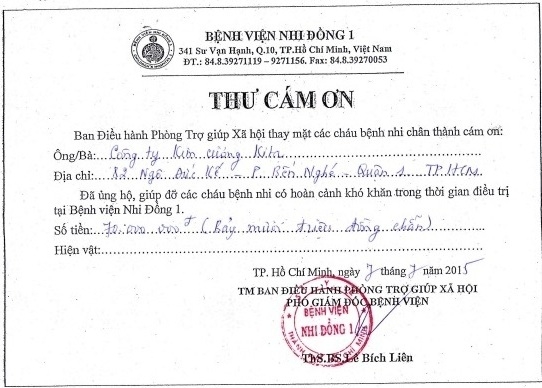 Với mong muốn giúp đỡ các bệnh nhi nghèo tháng 7/2015 KITA ủng hộ viện phí cho bệnh nhi bệnh viện nhi đồng 1